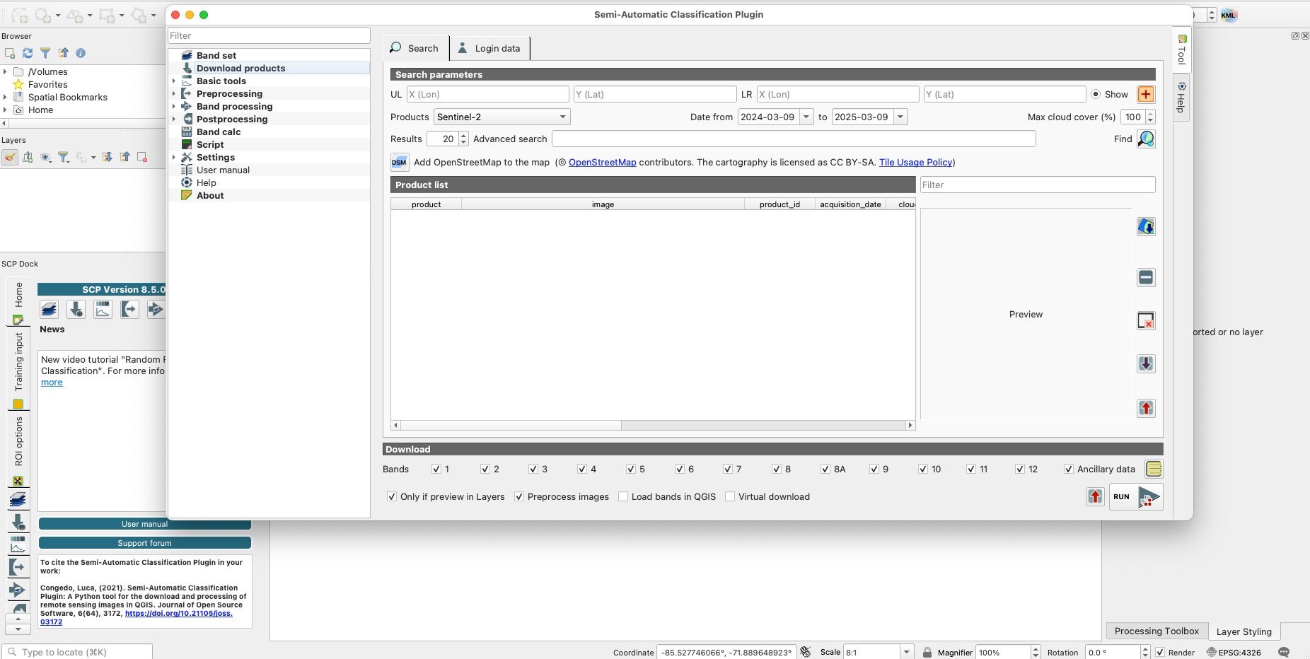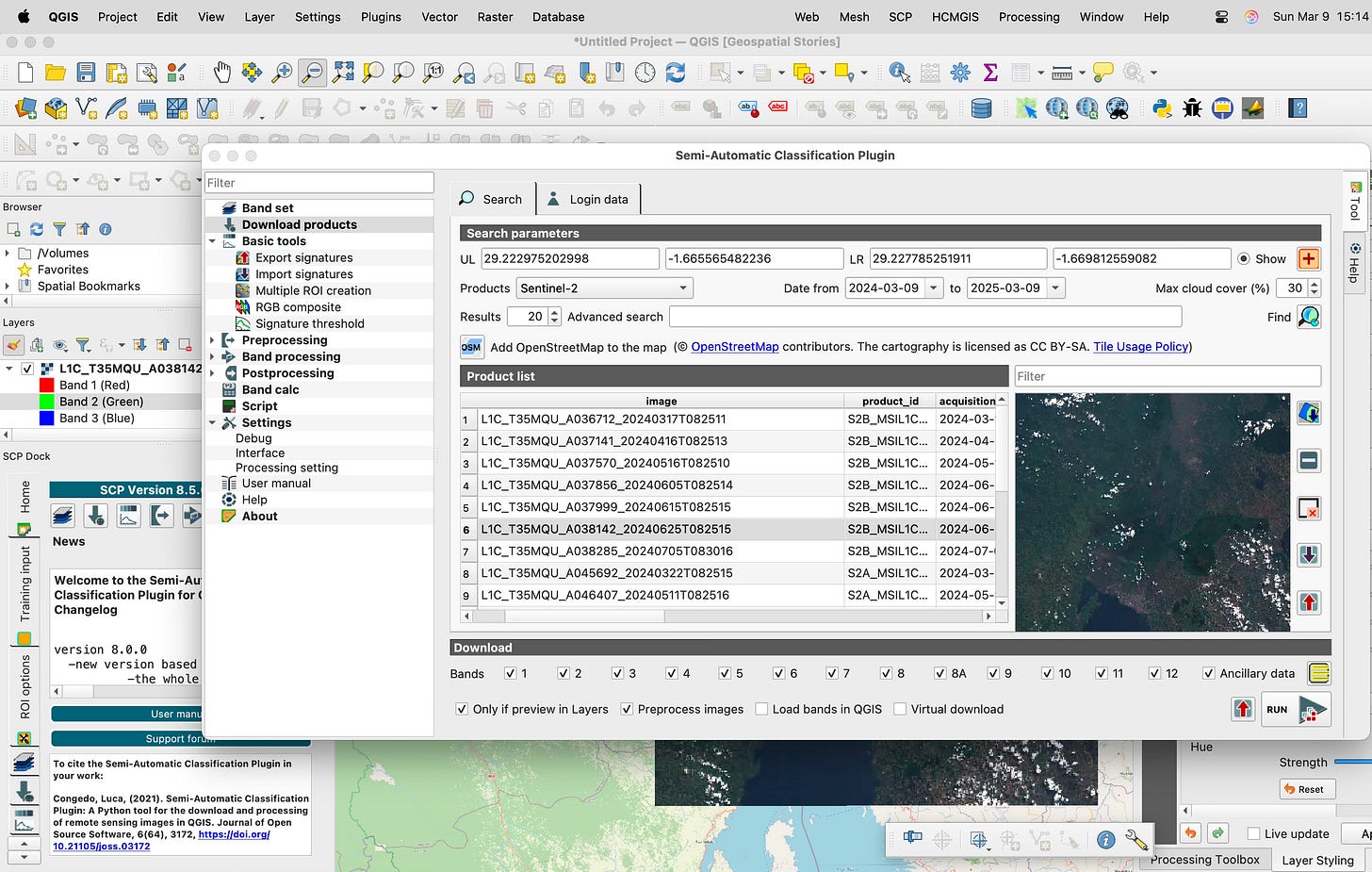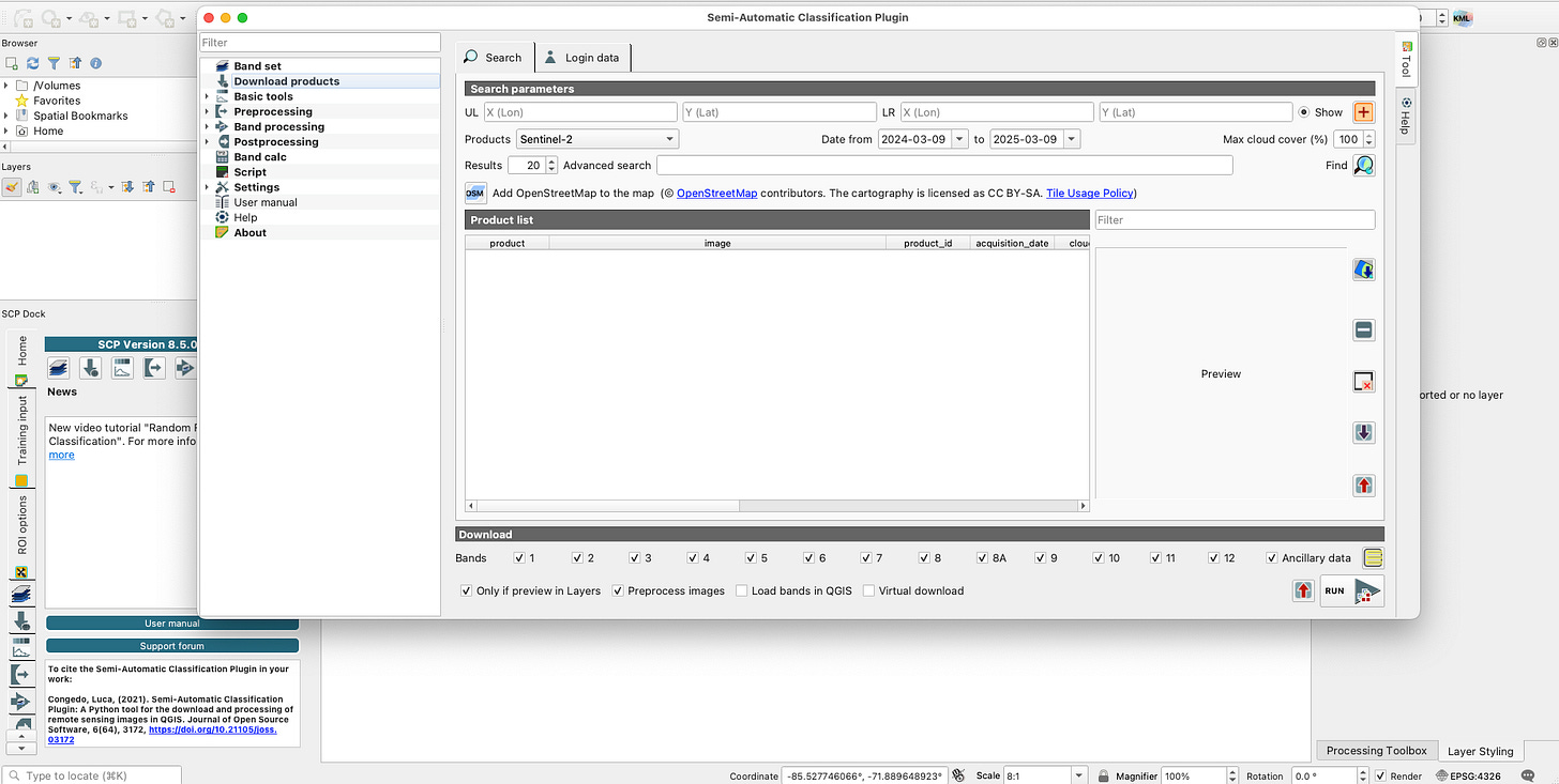 Now we find the products by selecting the magnifying glass on the right. Once the images populate they can be previewed in the window or downloaded onto the QGIS canvas.
